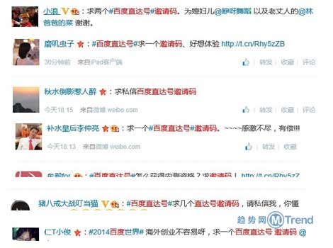 趋势网(微博|微信)讯:上午百度宣布推出直达号后,内测限量邀请码被一抢而空,紧接着下午百度又放出了一批邀请码,当然也是热门到脱销,许多用户因为没有抢到而发信息求百度直达号邀请码。