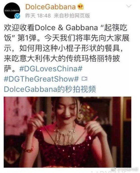 在DG官方微博放出的上海大秀视频“起筷吃饭”的广告中,试图把中国传统文化与意大利经典饮食相结合,用中国筷子吃意大利特色食物。但是,片中的旁白的中式发音、傲慢的语气和中国模特用奇怪的姿势使用筷子吃Pizza和意大利式甜卷等片段,被网友质疑存在歧视中国传统文化和刻意丑化中国人。